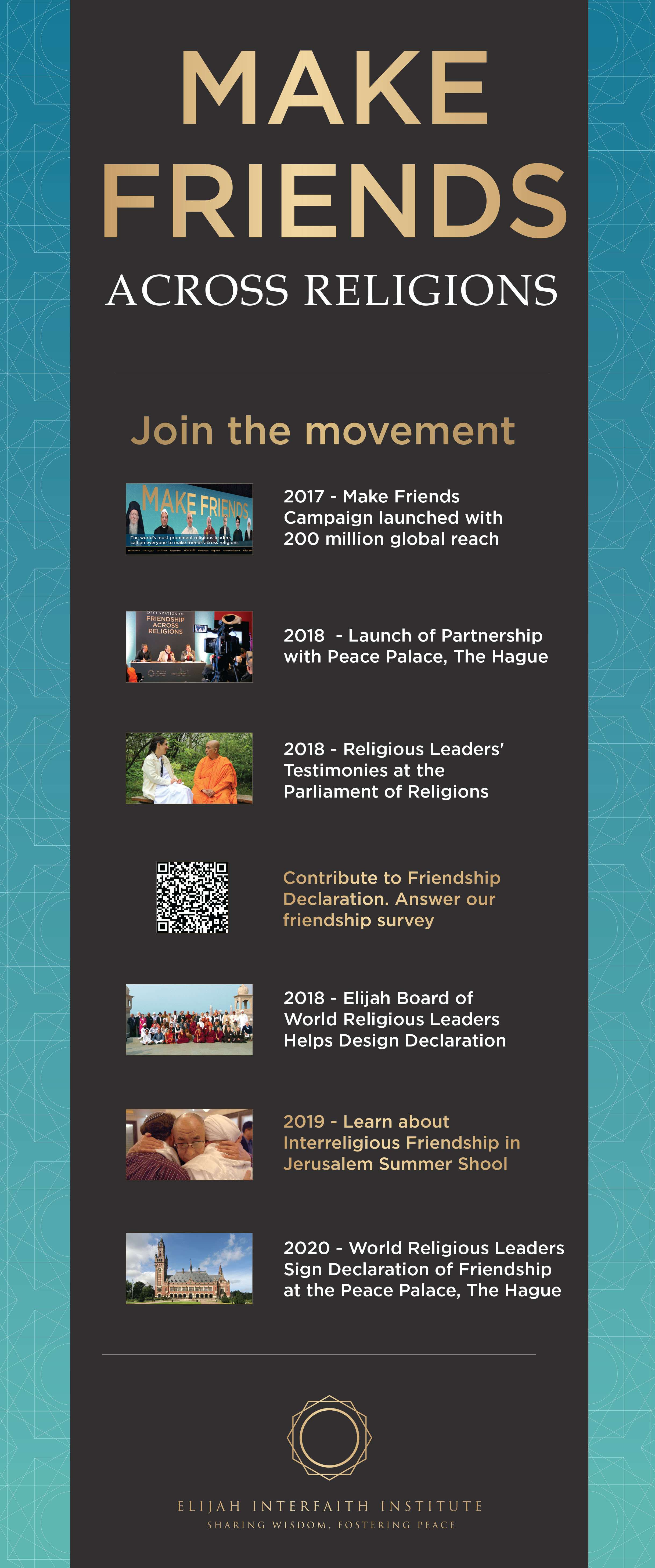 Following our Make Friends initiative and the recent partnership with the Peace Palace in the Hague (https://elijah-interfaith.org/news/newsletter-september-2018), we will be convening 15 voices of religious leaders from 7 religious traditions at the parliament to share personal stories of interreligious friendship and to offer wisdom and insight on how to cultivate friendship across religions. Join us for these powerful high-level sharings.